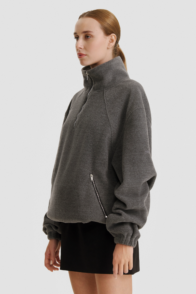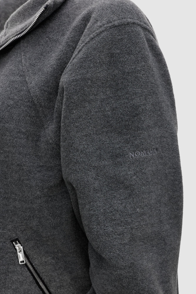 A high stand collar, elasticated cuffs, and a diagonal technical zipper add function to the minimal form, while the subtle NOMAKA emboss anchors it within the collection’s design language. Light, easy, and structured - ideal for layering or wearing as a standalone piece in transitional weather.